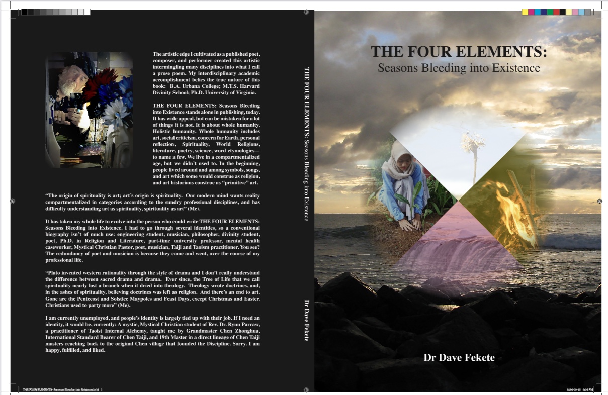 It has taken my whole life to evolve into the person who could write THE FOUR ELEMENTS: Seasons Bleeding into Existence. I had to go through multiple identities—since self is defined by job, today—engineering student, musician, philosopher, divinity student, English Literature student, poet, Ph.D. in Religion and Literature, part-time university professor, mental health caseworker, Mystic, Mystical Christian Pastor, poet, musician, Taiji and Internal Taoist Alchemy, among many. All that and more went into THE FOUR ELEMENTS: Seasons Bleeding into Existence, and you can read it. It truly is my Magnum Opus. Yet this book may well be the swan song of the mind who wrote it.